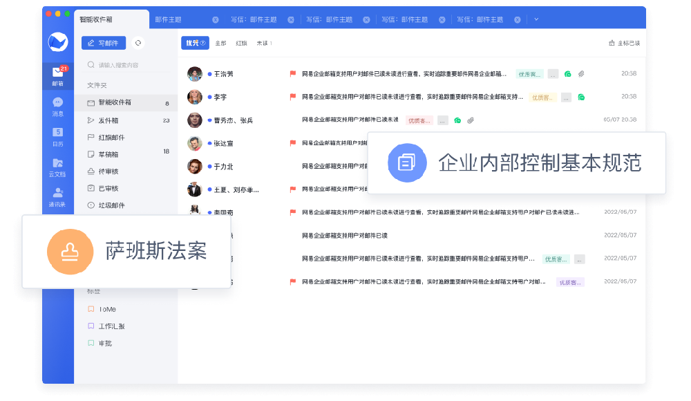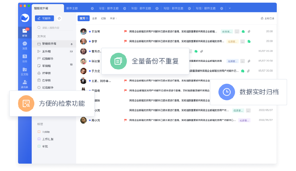 网易企业邮箱既支持本地归档,也支持云上萨班斯归档,可长期保存邮件数据,实时快速检索,数据备份无忧,回溯方便快捷。