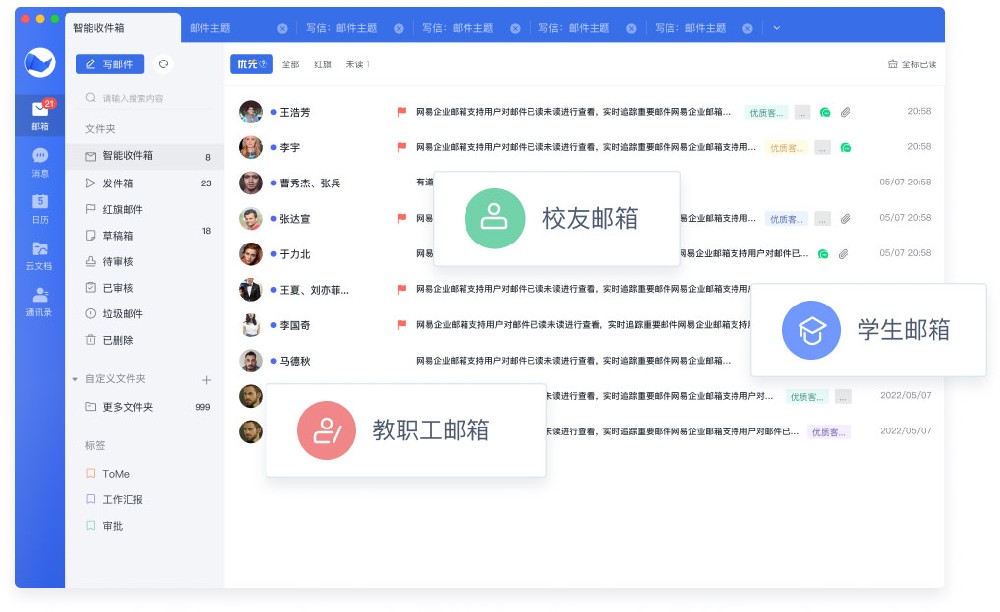 校园氛围年轻化,传统邮件功能单一,需要互动的社交型邮件功能,邮件管理需要融入日常高校学习生活场景。