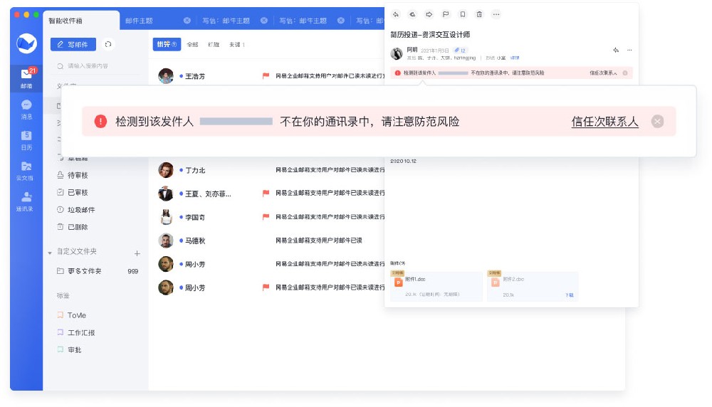 基于网易智能化识别技术,自动识别滤除风险邮件,牢筑邮箱安全屏障,原厂技术团队提供7*16小时热线电话实时响应服务,客户即时报备可疑邮件,后台即时更新相关策略。