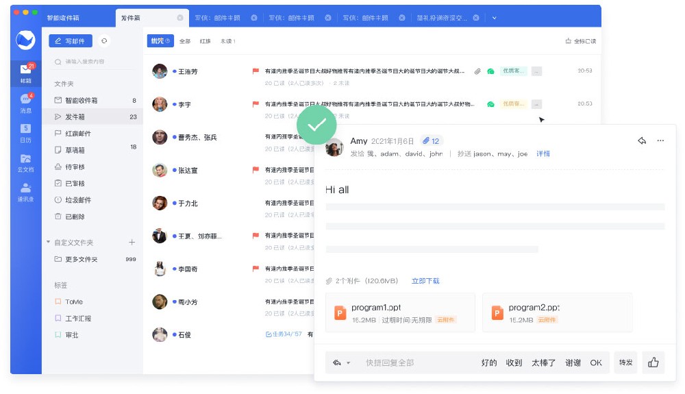 立足教育行业的实际需求,提供邮件的高阶功能。支持任务邮件,教研任务进度实时掌控;支持邮件讨论组,轻松发起科研项目讨论;支持表扬邮件,表彰校内先进个人。