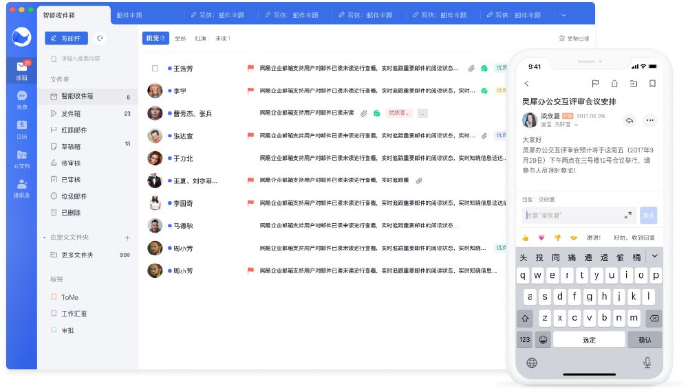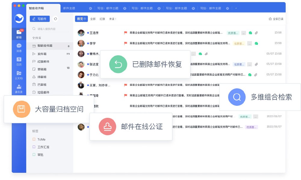 提供专属客户端,以邮件能力为核心,同时融合IM即时消息、云文档、日历日程、通讯录等功能,满足企业协同办公需求。