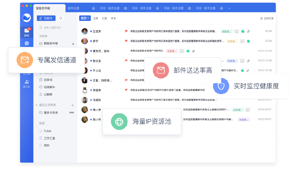 网易企业邮箱为满足企业大批量发送事务邮件的需求,使用独立IP资源池,建立独立服务节点,以实现事务邮件的精准送达。