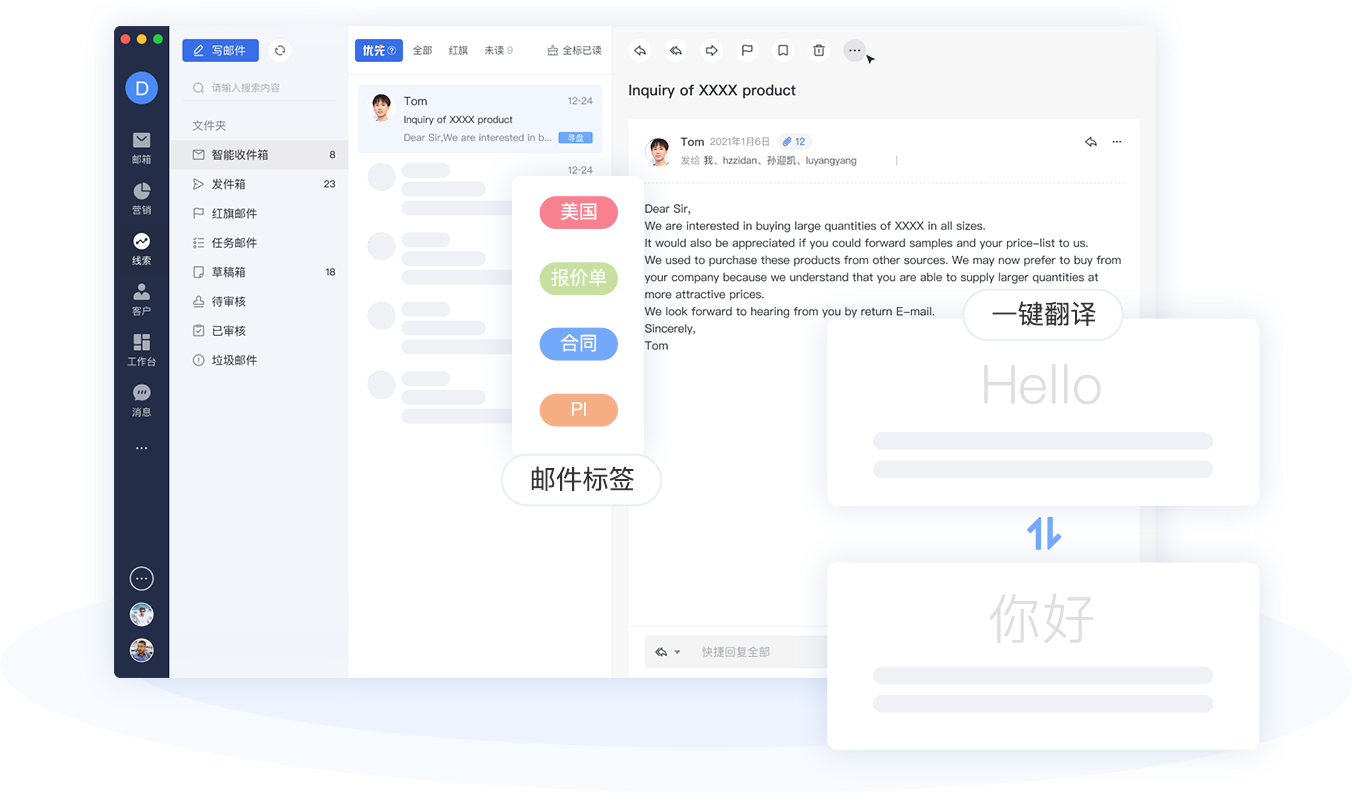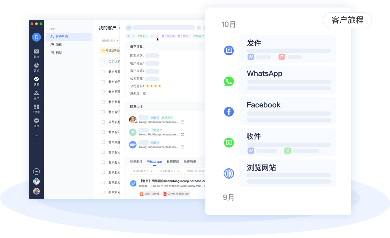 外贸企业商务沟通平台分散,信息分布在微信、邮件等各个办公沟通平台,管理难度大,同时,数据易丢失且回溯难,集中的商业化数据管理对企业至关重要。